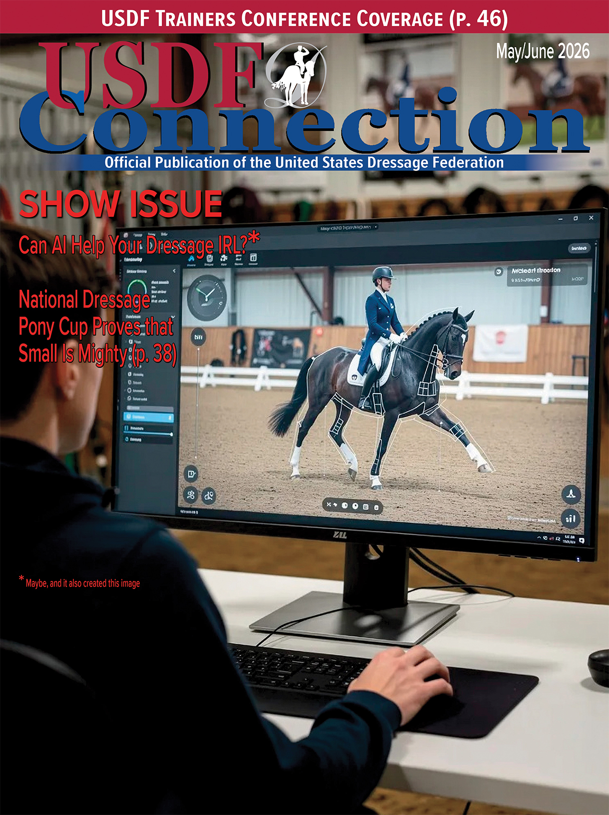 USDF Connection is mailed to members of the federation and subscribers. It offers an informative mix of USDF and American dressage news; a calendar of programs, events and horse shows; educational articles; feature stories; and commentary by many of the most recognized and respected names in dressage.